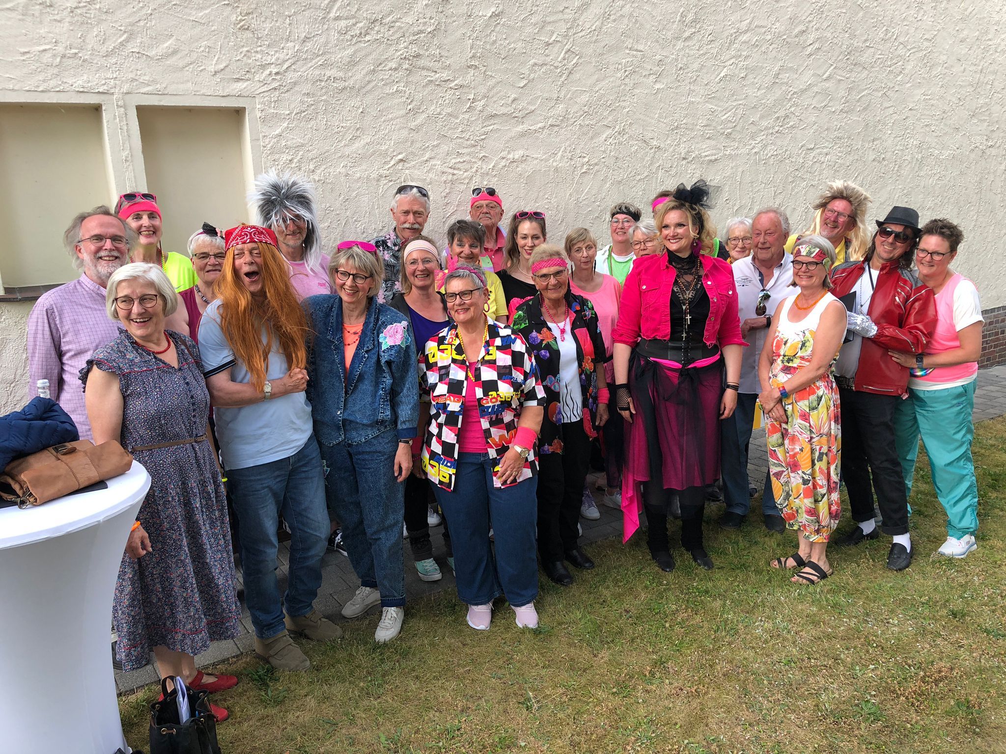 Die Sänger:innen der Kantorei Wersen im 80er Jahre Outfit beim Sommernachtstraum 2023 unter dem Motto "Die 80er Jahre"